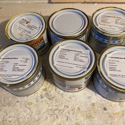 Selger mange fargeprøver av interiørmaling. Perfekt hvis du skal velge farge og vil teste på vegg før du kjøper store og dyre spann i butikken.
