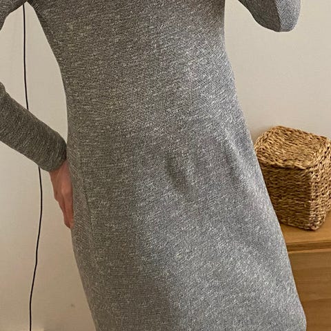 Modellen har lange ermer og rund hals. Strikket struktur i stoffet gir et jevnt og mykt uttrykk.