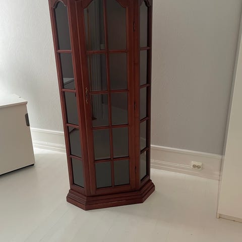Vitrineskap i tre med brun finish. Øvre del har glassdører med sprosser og hyller for oppbevaring og utstilling av servise, glass eller pyntegjenstander. Nedre del har tette dører med oppbevaringsplass til ting som ønskes skjult. Klassisk utforming med profilerte kanter og dekorative håndtak. Passer i stue, spisestue eller kjøkken som oppbevarings- og utstillingsmøbel.