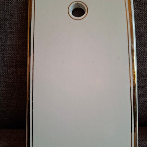 Denne er Gammel og har små bruksslitasjer og et hakk i hjørnet bak .