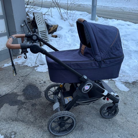 Emmaljunga NXT90 i marineblå med liggedel, ergonomisk sittedel, søskenbrett, regntrekk og myggnetting. Vognen er kjøpt i 2021, søskenbrett fra 2023 Sittedelen har også vintertrekk/pose.