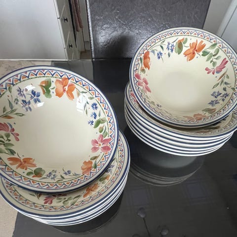 10 middagstallerkener, 11 skåler, 2 serveringsskåler, 1 skål til saus.