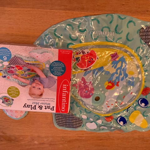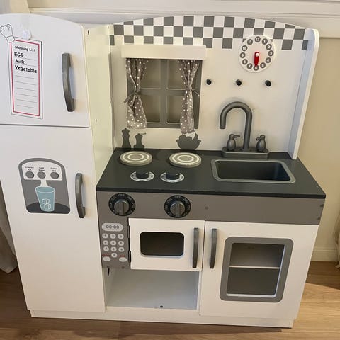 Lekekjøkken i tre i hvit og blå farge. Kjøkkenet har koketopp med markerte plater, dreibare knotter og enkel bakvegg med oppheng for kjøkkenredskaper. Settet inkluderer gryte og stekepanne i matchende farger. Egnet til rollelek for barn som liker å late som de lager mat.