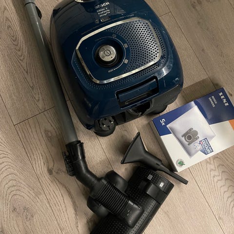 Støvsugeren er en posemodell med regulerbar effekt via dreiebryter på toppen. Den har teleskoprør i metall og standard gulvmunnstykke egnet for harde gulv og tepper. På toppen står det «Bosch Motor Technology – Made in Germany».