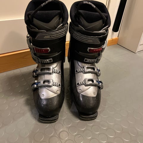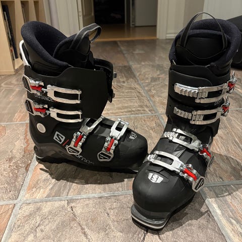 Salomon Mission alpinstøvler i størrelse 29.5. Støvlene har fire justerbare spenner i metall og powerstrap øverst for bedre tilpasning rundt leggen. Ytterskallet er i hovedsak svart med hvite felter og røde detaljer, med polstret innersko med rød og svart fôr.