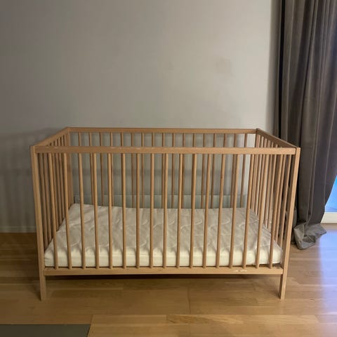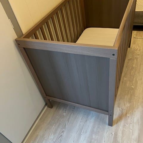 IKEA sprinkelseng i nøytral farge. Sengen har klassiske sprosser på begge langsider og hel gavl i hode- og fotende. Under sengen er det integrerte skuffer for ekstra oppbevaring. Bunn med lameller følger med. Passer standard madrass til sprinkelseng. Egnet for baby og småbarn. Følger med nesten ubrukt madrass denne sengen har stått oss mormor men siden lille gull bare ville sove i mormor sin seng blir den bare stående å ta plass. Går an å ta bort grinden på den ene siden se bilde i annonsen som jeg har lånt av ikea.