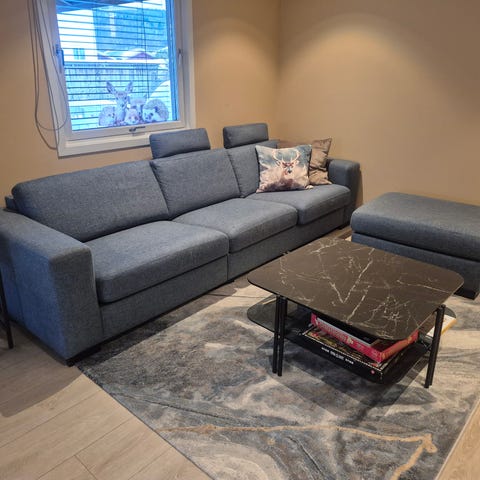 Durefritt ogcrøykfritt rent hjemm. Brukt av fam på 3. Vaskbare putetrekk. Noe slitasjevpå stoff i bunen under pute som kan lett fikses. Pris for alt sammen totalt 4500 nok.