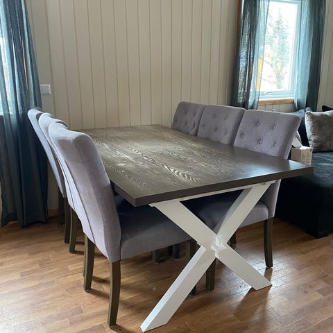 Godt brukt er kun synlig flekker på bordet som kan pusses . Bordet er kjøpt fra feel.