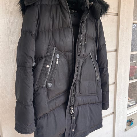 Cedrico dun vinterjakke for dame i størrelse L. Jakken er svart og fylt med dun, noe som gir god isolasjon på kalde dager. Modellen har hette med pelskant, høy krage og glidelåslukking i front. Flere ytterlommer med glidelås gir plass til oppbevaring av småting. Egnet som varm ytterjakke i vinterhalvåret.