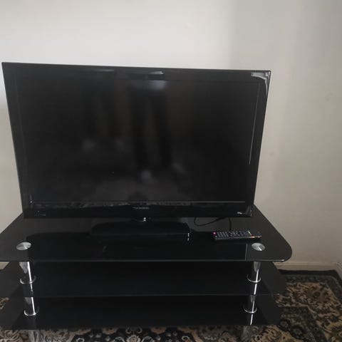 Philips 48" TV. Skjermen leveres med strømledning og fjernkontroll, som vist på bildet. Det er også inkludert svingbart veggfeste. ( følger ikke med stativ så den står av seg selv..)