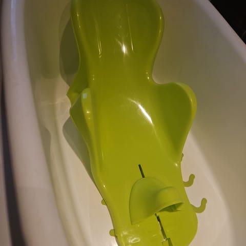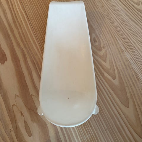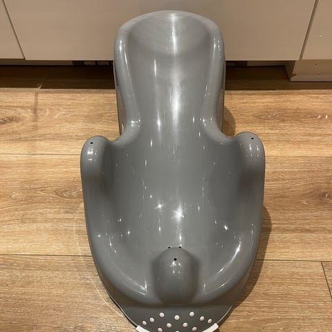 Baby badestol i plast i grå farge. Utformet for bruk i badekar for barn fra 0 til 8 måneder, med maks vekt 9 kg (ifølge merking).Laget i hard plast som er enkel å rengjøre. Egnet til bruk ved bading av spedbarn