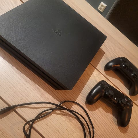 Sony Playstation 4 Pro 1TB spillkonsoll i svart farge med to trådløse kontrollere. Følger med 7 spill.