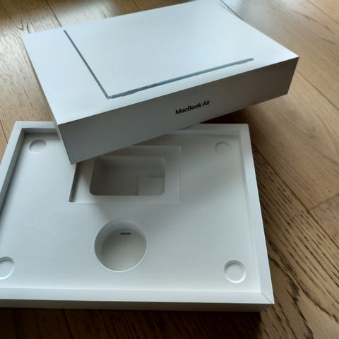 Apple MacBook Air eske i hvit papp. Esken er original emballasje for en MacBook Air‑laptop.