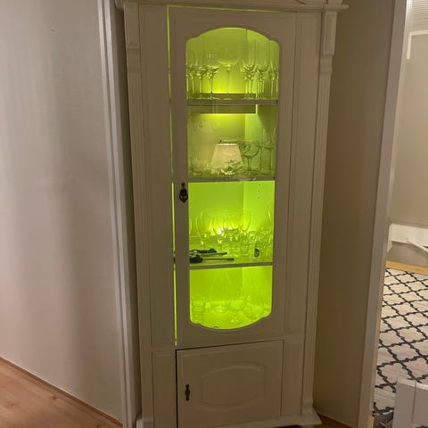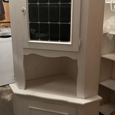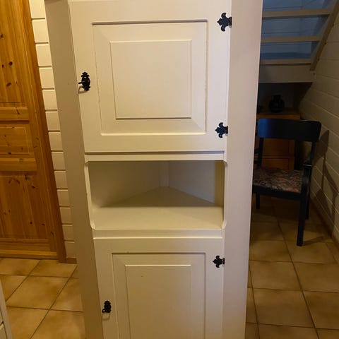 Meget pent kråskap i heltre, med bakside i finer. Hyller i heltre. Ubehandlet, men har stått uten direkte sol, så treet er fint. Høyde ca 183 cm, bredde 60 x 60, dybde på benkeplaten er ca 53 cm. Komplett med 2 nøkler ( behold, som må være ganske unikt 🙂)