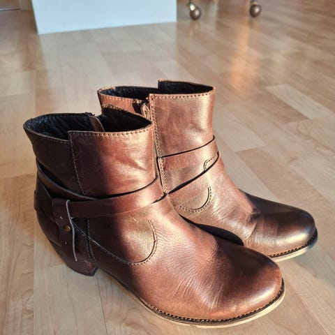 Gabor sko i brun skinn i størrelse 39. Ankelhøye støvler med hæl og glidelås på siden. Overdel i skinn med enkel sømdetalj, syntetisk yttersåle og stablet hæl. Passer som hverdagsstøvler eller til penere antrekk for dame. Selges pga feil størrelse.