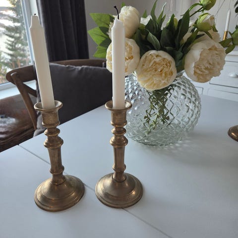 2 eldre lysestaker i messing selges samlet for 300,-. 26 cm høye. Kan trenge en puss.
