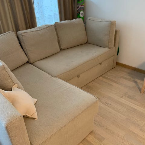 Pent brukt sofasett i varm beige farge. Består av en 3-seter som kan slås ut til seng, samt en 2-seter. & 1 seter sofa. Komfortabel å sitte i og praktisk for overnattingsgjester.