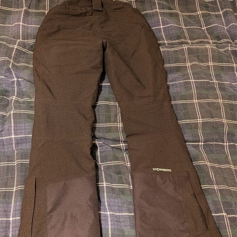 Fint brukt svart vattert alpinbukse. Avtagbare seler. 2 lommer framme med glidelås. Str. 42