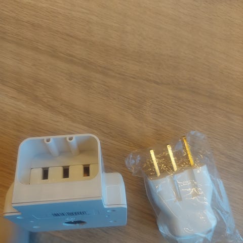Universal reiseadapter i hvit plast. Adapteren har flere ulike plugger for bruk i forskjellige land og ett standard jordet uttak på toppen. Egnet for tilkobling av elektriske apparater med vanlig støpsel til ulike stikkontakter på reise.