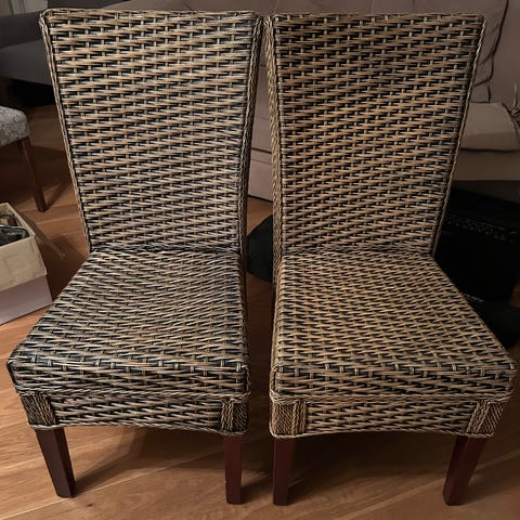 Selger 8 spisestuestoler i heltre med skinn, 2 stoler med armlene. Stolene er solide, velholdte og har et tidløst uttrykk som passer godt både i trandisjonelle og moderne hjem. Selges for kr 150 pr stykk.