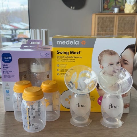 Medela brystpumpe, vakum melkeoppsamler, 2 sett ull innlegg, nesten full pakke ammeinnlegg, 9 oppbevaringsbokser, 4 fryseposer.