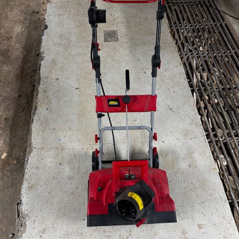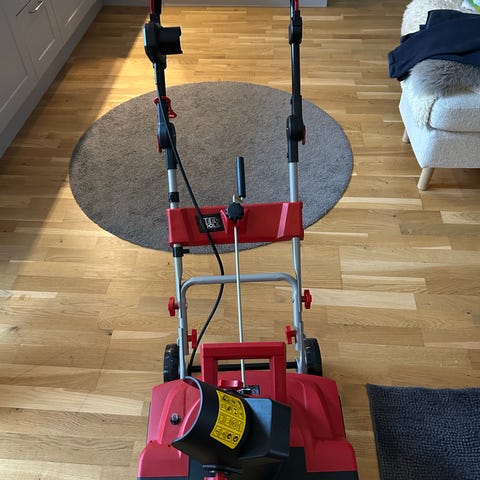 Meec Tools elektrisk snøfreser i rød farge. Modellen har elektrisk drift via ledning og er utstyrt med håndtak og justerbart skaft for enklere håndtering. Passer til fjerning av snø på mindre områder som innkjørsler, gangveier og terrasser. Konstruksjonen har roterende fres i front som kaster snøen til siden. Enheten har strømtilkobling med jordet støpsel og er beregnet for bruk på fast underlag. Ekstra håndtak mangler, men har ikke vært noe stort problem for oss. Selges grunnet innkjøp av ny snøfreser