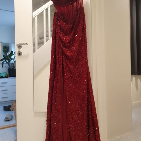 Rød maxikjole med sjal fra Gitzy selges da den ikke blir brukt. Noen få bruksmerker, selges for 500kr. Kjøper betaler frakt.