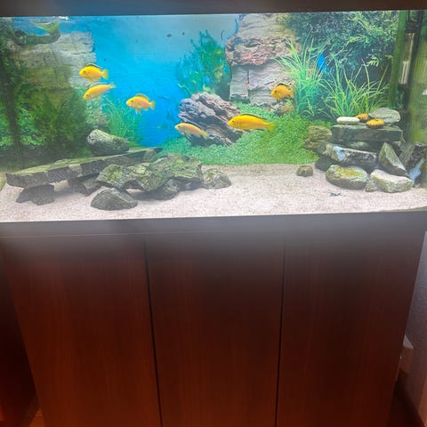 Akvariet er fra 2012. Det har vært i bruke hele tiden, og er fremdeles i bruk. Lysarmatur virker ikke, samt noen bruksmerker som striper i glasset, men ellers er akvariet i god stand. Tilsvarende akvariet med møbel har en nypris på ca 12 000,-.