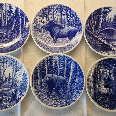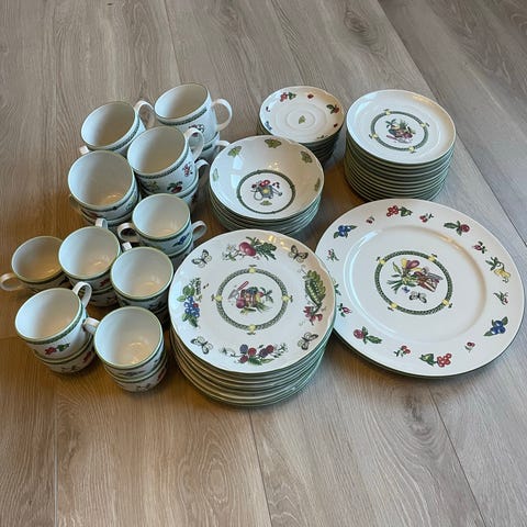Merk at middags og suppetallerkene har forskjellige mønster. Er nok fra to ulike serier, men er brukt sammen, da fargene er like.