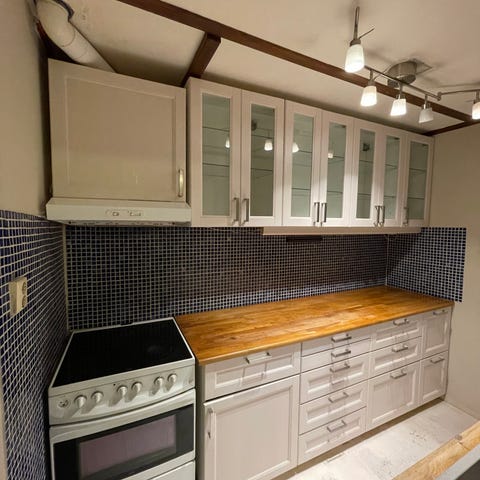 Mikrobølgeovn, oppvaskmaskin og koketopp har ukjent alder, trolig er de like gamle som kjøkkenet. Fungerer feilfritt.
