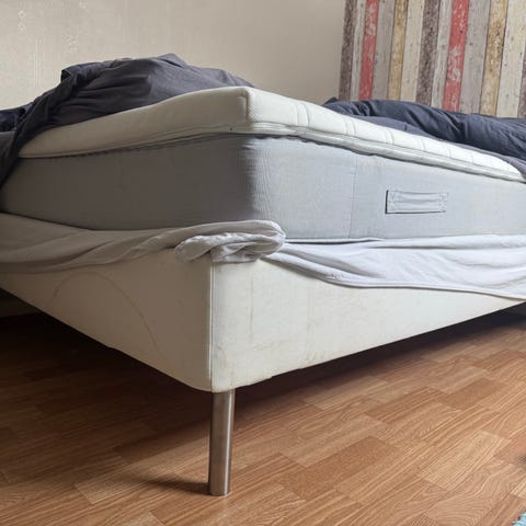 Svane seng uten overmadrass. Sengen består av to underdeler med ben og en hel hovedmadrass på toppen. Glidelås på hovedmadrass er defekt. 180x200cm. Ben på bildet følger ikke med. De bena som følger med er 6cm (avbildet med 19cm).