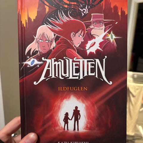 Kazu Kibuishi Amuletten Alveprinsen bok. Norsk utgave av tegneserieromanen «Amuletten: Alveprinsen». Innbundet bok med illustrert omslag. Boken tilhører fantasy-serien «Amuletten» og inneholder fargerike tegninger og tekst i tegneserieformat. Passer for barn og unge som liker fantasy og grafiske romaner.