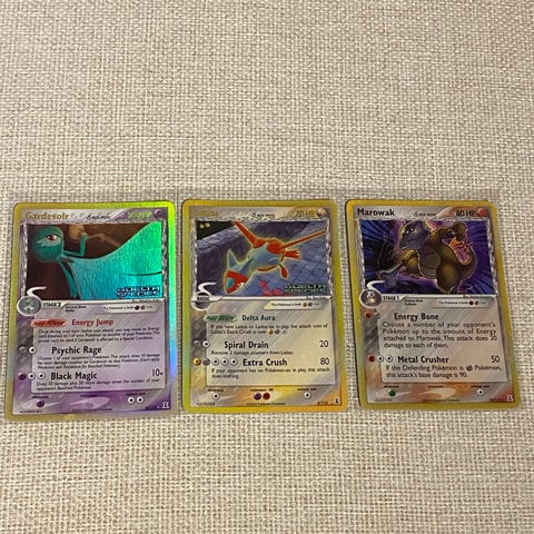 Pokémon samlekort, sett med 4 holografiske kort. Kortene har standard Pokémon-bakside og motiv av ulike Pokémon-figurer på forsiden.