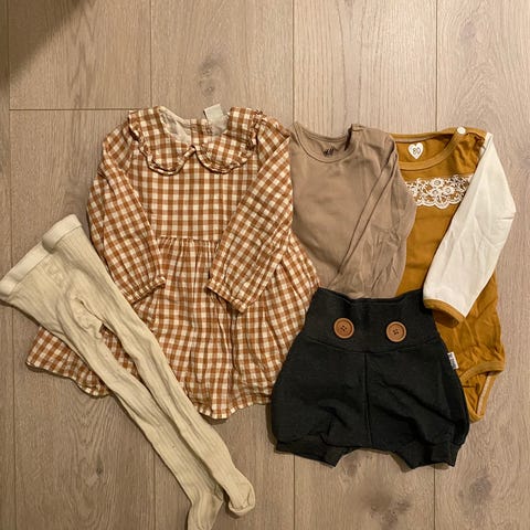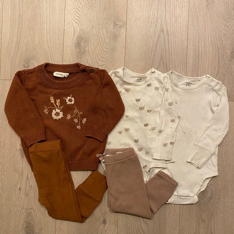 Klespakke i str 86, fra Lindex, Zara og H&M. Buksa med regnbue på har noen flekker som ikke får vekk i vask