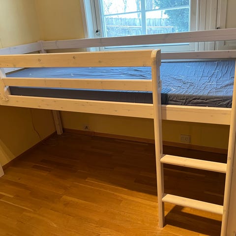IKEA loftseng for barn i hvit utførelse. Sengen har integrert stige på siden. Under sengen er det åpen plass som kan brukes til oppbevaring, eller lek. Noe merker etter tusj og klistremerker enkelte steder. Sengen er demontert med 2-delt sengebunn.