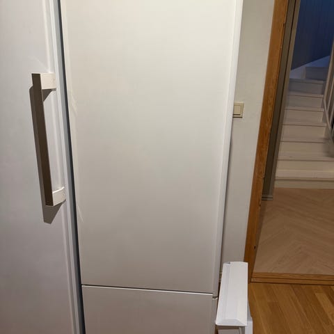 Samsung kombiskap. Kjøledelen har flere justerbare glasshyller og dørhyller for oppbevaring av matvarer og flasker. Frysedelen nederst har tre gjennomsiktige skuffer. Må hentes