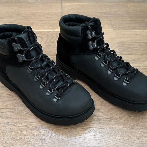 & Other Stories støvler i størrelse 42. Modellen er ankelhøy med snøring og kraftig yttersåle. Skoene er laget i brunt skinn med mørke lisser og metallhemper til snøringen. Sålen har grovt mønster som gir godt grep. Passer som hverdagsstøvler eller til lettere turbruk i variert vær og underlag.