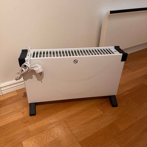 Frittstående konvektorovn i hvit farge med svarte ben. Ovnen har mekanisk termostat og regulerbar effekt via dreiehjul på siden. Den er utstyrt med bærehåndtak øverst for enkel flytting. Egner seg til oppvarming av mindre rom, som bod, soverom eller kontor, der man ønsker ekstra tilleggsvarme. Brukes stående på gulv på en jevn og stabil overflate, med fri luftstrøm rundt ovnen for sikker drift.