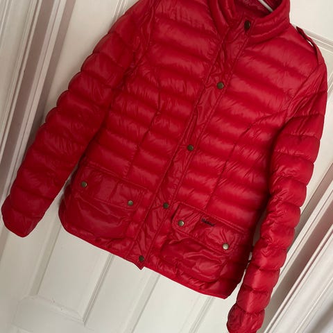 Klassisk Barbour-Olivenfarget (vises ikke så godt på bildet) som dessverre har blitt for liten og blir nok ikke passe igjen. Fuskepels på kragen.