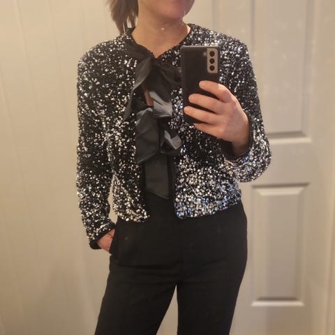 Soaked in Luxury paljettjakke for dame i størrelse XL (vil si L siden jeg er S). Jakken er dekket av gullfargede paljetter og har glatt fôr på innsiden for økt komfort. Kort, åpen modell. Passer som ytterlag over topp eller kjole ved anledninger der man ønsker et mer pyntet uttrykk. Materialet består hovedsakelig av paljetter på tekstilbase, med fôret innside for bedre passform og bevegelse.