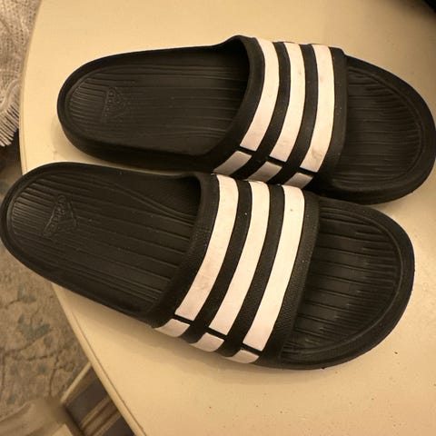 Adidas badesandaler for barn i størrelse 35. Unisex-modell i svart med hvite striper. Åpen tå og hæl med bred rem over foten. Såle og overdel i syntetisk materiale som tåler fuktighet og er egnet til bruk ved basseng, strand eller som innesko.
