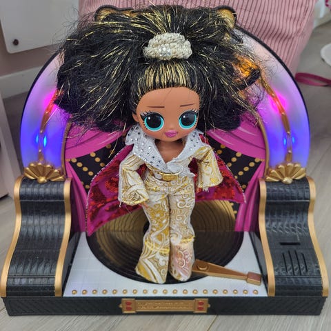 L.O.L. Surprise OMG dukke med scene og lys. Settet består av en dukke i glitterdrakt og en tilhørende scene som spiller musikk og har fargerike lys.