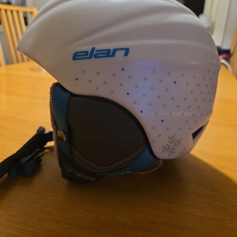 Elan skihjelm i størrelse 52–56 cm. Hjelmen er hvit med flerfarget Elan-logo trykk rundt hele skallet. Innvendig har den polstret fôr for økt komfort, og øreklaffer med netting for ventilasjon. Vekt er oppgitt til 315 g. Egnet som skihjelm eller snowboardhjelm for bruk i alpinbakke.