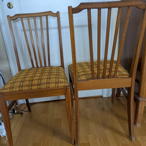 Kule vintage kjøkkenstoler i teak med messingdetaljer, stoffsete og rygg. Fungerer som de skal, men kan også trekkes om og bli enda lekrere! Selges samlet for 600 kroner.