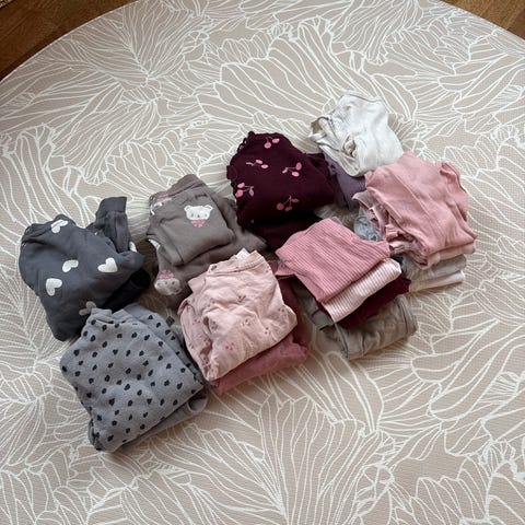Stor pakke med ullklær i størrelse 80. Et par plagg i størrelse 74 og et par i 86. Pakken består av ulike plagg i ull, blant annet bodyer, bukser, heldress og pysj. De aller fleste plagg har flekker, et fåtall har små hull. Mye bruk igjen.