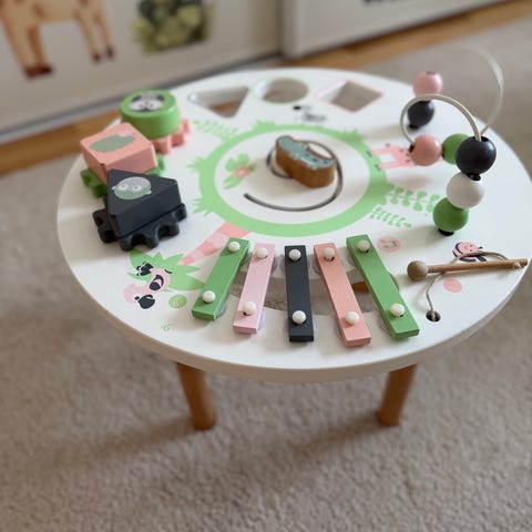 Little Dutch bankebrett i tre. Malt i dempede pastellfarger. Leketøyet kan brukes til å banke sylindrene ned gjennom hullene og deretter snu benken for å fortsette leken. Egnet som aktivitet for små barn til trening av hånd-øye-koordinasjon og finmotorikk. Kjøpt ny av oss. Pent brukt, noen små merker på sidene. Originalembalasje kan følge med.