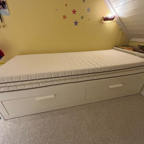 Passer som juniorseng eller ekstraseng, og gir ekstra sengeplass ved behov. Konstruert i trebasert materiale med ribbebunner i tre. Egnet for rom der det er behov for både seng og oppbevaring på liten plass.