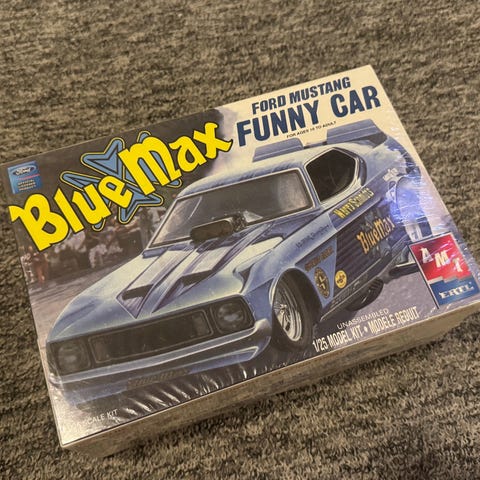 Modellsett av dragracebilen Blue Max Funny Car, levert som ubygget plastmodell. Settet inneholder deler i plast som monteres og males etter anvisning i bruksanvisningen.