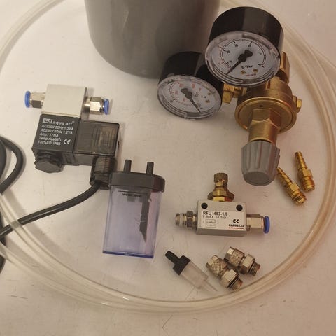 Komplett 2 liter co2 sett. Med magnetventil og regulator. Fungerer som det skal. Vært på en 180liters akvarium.