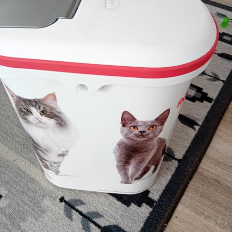 Beurer kattematbøtte med lokk i plast. Beholderen har motiv med katter på siden og et grått lokk med egen åpne-/lukkefunksjon. Egnet til oppbevaring av tørrfôr eller annet katteutstyr. Laget i hard plast, i hovedsak hvit med grå detaljer.